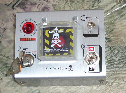 The “fine print” on the plastic cover over the button says, “Please leave this area within five seconds of pressing this button.”