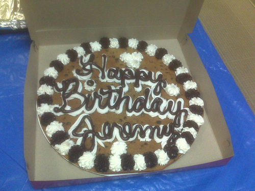 We almost always celebrate birthdays as a family on the actual birthday, even if there is a party with friends some other time. So even though Jeremy wanted to wait til Jason got here to celebrate his birthday, it seemed a little sad to not to anything on the actual day. So yesterday we went out to lunch at the restaurant of his choice. Then I ordered a decorated chocolate chip cookie cake to take to a church fellowship last night.