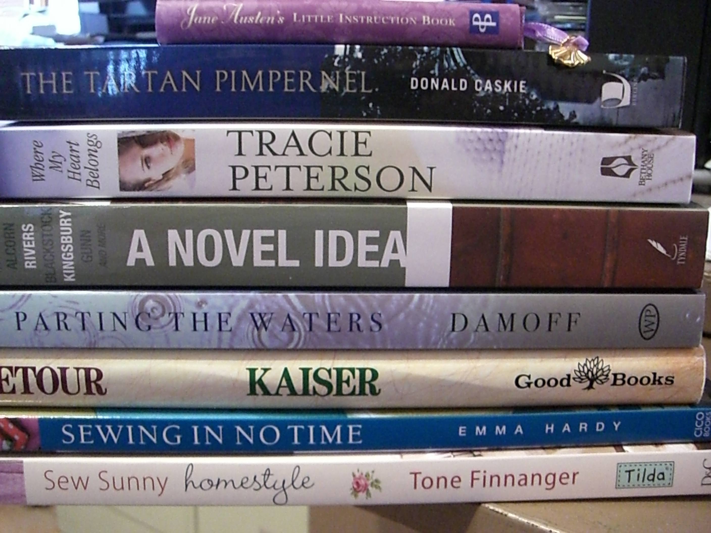 To answer the last question first, I almost always have books on my “wish list.” I keep a running list of books I might want to read (which has grown exponentially since blogging), and our family likes to work with a list of ideas when a gift-giving occasion comes up, so I peruse that list to see what I might want to add. But when a favorite author has a new book coming out, I don’t usually wait to put it on a wish list — I usually go ahead and get it. I don’t feel too badly about spending the money — it is an investment in entertainment (and we don’t spend much money on entertainment in general), in education and brain stimulation, sometimes in spiritual growth, and I am supporting working artists. 🙂