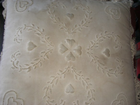 The front is pilling a little bit — I probably used cheap fabric. But we’ll see if it can be salvaged. I also found another pillow that I had spent hours embroidering and lost track of. Somehow it was stored in an open box and got all gunky.
