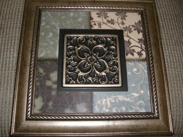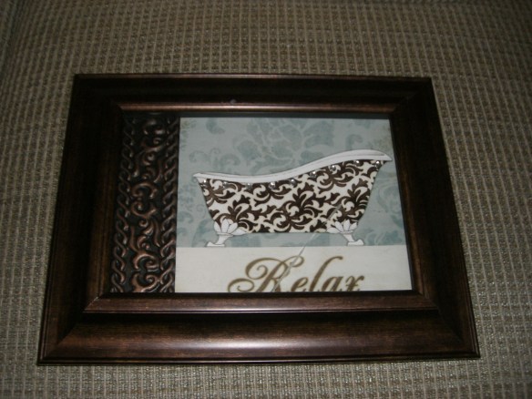 5. Great finds. One bathroom is a little bare of decorations, so I have been keeping my eye out for something suitable in a brown/beige/tan/blue combination. I found the first at Joann’s and the second at Hobby Lobby, both 50% off.