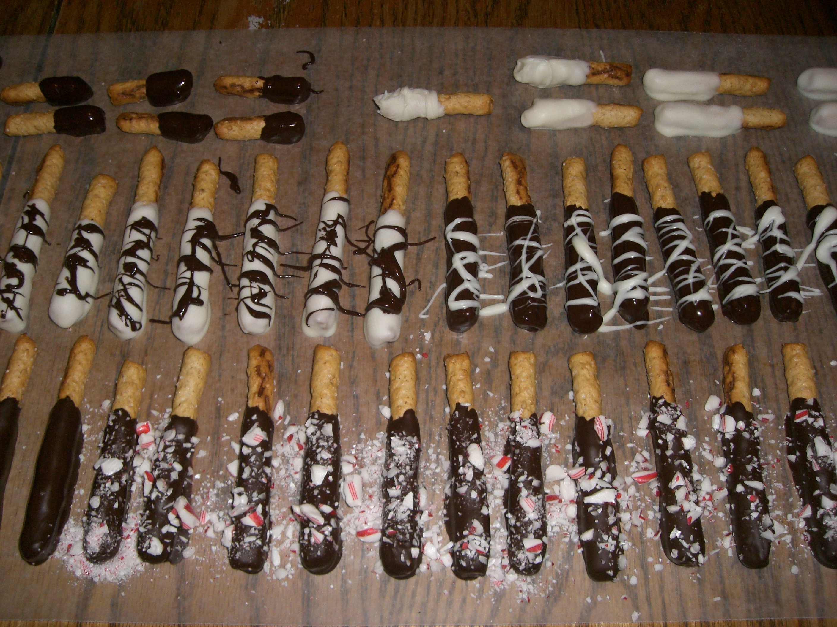 The treats are pretzel sticks dipped in chocolate, with some of them sprinkled with peppermint.