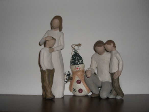 You son wanting to draw happy faces on the Willow Tree family cracks me right up. As does the ornaments turning up in odd places. Too fun.