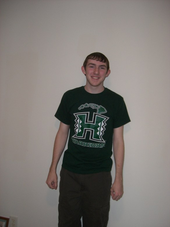 4. Winning! I won one of Thom and Quilly’s prizes for a 12 Days of Christmas, Island Style as well as one of Mocha With Linda’s Booked For the Holidays prizes. Plus I won fourth place in our Sunday School teacher’s annual quiz over the Biblical Christmas narratives and won a yo-yo he made. I neglected to take photos, but Linda’s prize was two books, always a good prize for me, and Thom’s was several items from Hawaii — macadamia nuts, dried mango, keychains, a note pad, a T-shirt, and my favorite, a little bottle of shells. Here’s Jesse sporting the T-shirt: