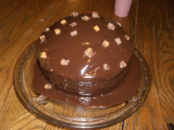 It was a chocolate fudge cake with peanut butter icing and fudge sauce drizzled over the top with bits of Reese’s Peanut Butter Cups on top.