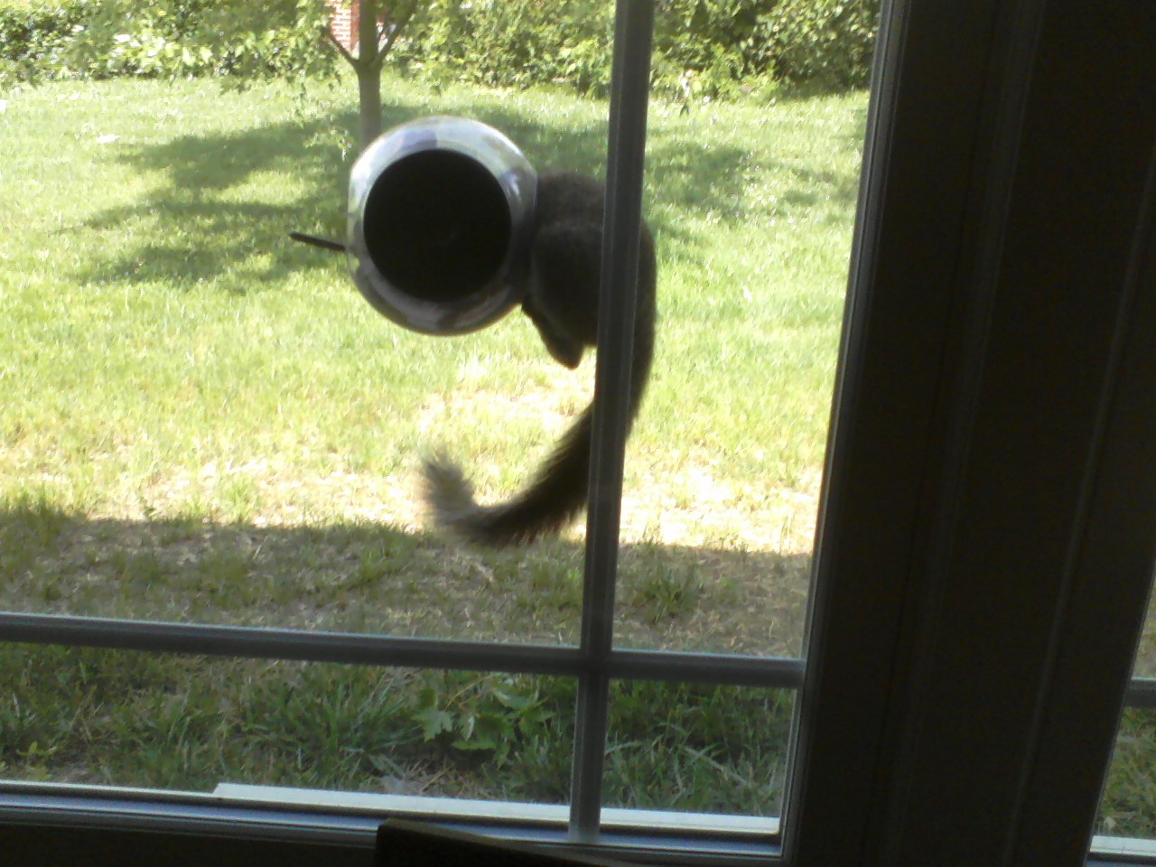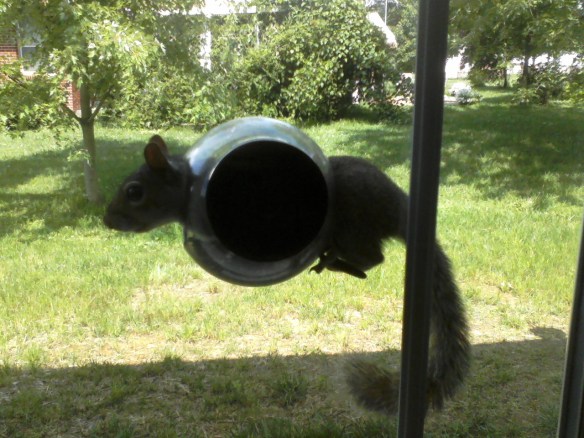 That round thing is a little bird feeder that sticks onto the window via a suction cup. We have it on my mother-in-law’s window and another standing bird feeder in the grass. This guy was in this feeder when I came in, and Grandma was getting such a kick out of him, that she hardly paid attention when I said I had her new fixed dentures. I was afraid he was going to get stuck, but thankfully he got through. Personally, squirrels have kind of lost their cuteness to me over the years because they can be pests, but she got such enjoyment from his antics, and seeing him like this was pretty funny.