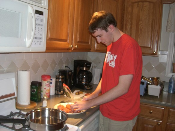 So Sunday I stayed home from church and basically took it very easy, and most of the week I’ve stayed home and kept my foot up as much as possible. Sunday Jason and Mittu came over and made dinner, and Monday I coached Jesse through his first meal. He had said he wanted to learn how to cook, so I figured this was a good time to start. π