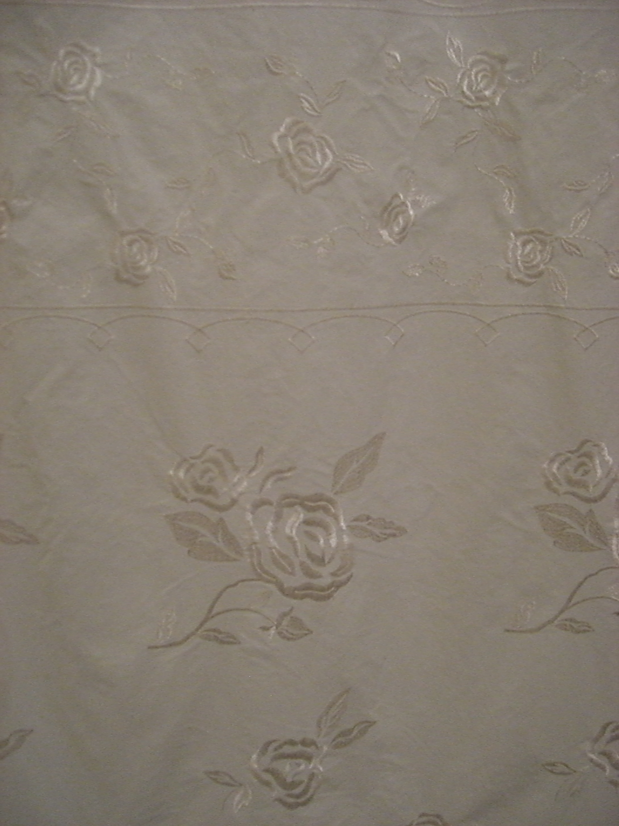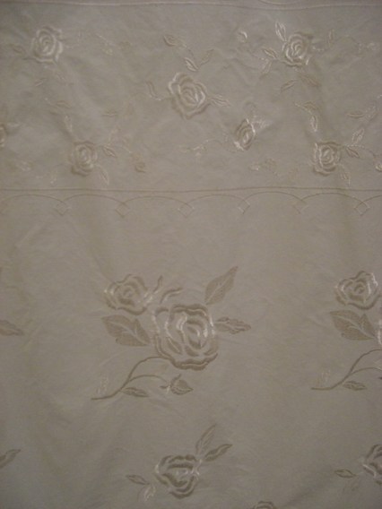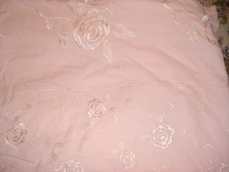 I used Rit color remover on it, but it still seemed to have a peachy cast to it. I had planned to dye it pink, but I felt that might be a little too overwhelming, even for me. So I put it away for several months, got it out this week, and decided in some lights it looked pinkish rather than peachy, ironed it, and hung it up.