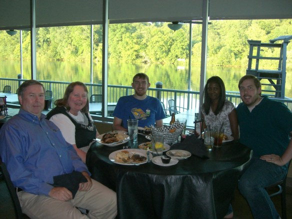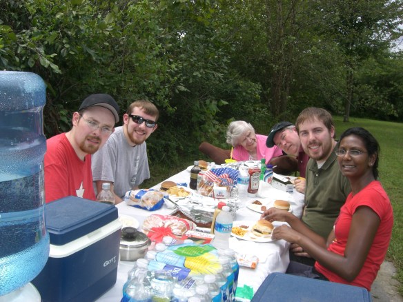 2. A picnic. Normally it seems like way too much work to me to pack up everything just to go eat somewhere else. But Jim took care of all the arrangements and the cooking. It wasn’t too hot in the shade. Jim and the boys went kayaking. Even Grandma got to come, though she slept through much of it. Then Mittu made dinner that evening. All in all it was a pretty relaxing day, for me anyway. 🙂