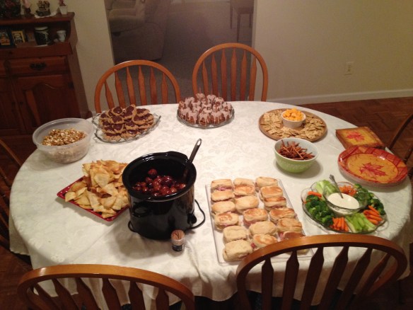 We had lots of goodies — homemade caramel corn, Choco Peanut Butter Dreams, barbecue meatballs, sandwiches, cheese and crackers from a guest, and Mittu made some great homemade tortilla chips and spinach dip. We’ve been enjoying leftovers all week even after sending a few things to my oldest son and giving some away to our guests.