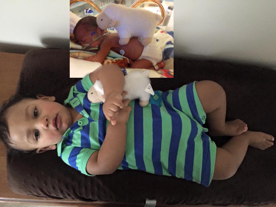 A nurse in the NICU suggested to Jason that he take a picture of Timothy every week with the same stuffed animal for reference to see how much he had grown and changed through the year. This is the photo from this week, with the photo from the first week superimposed so the sheep is the same size:
