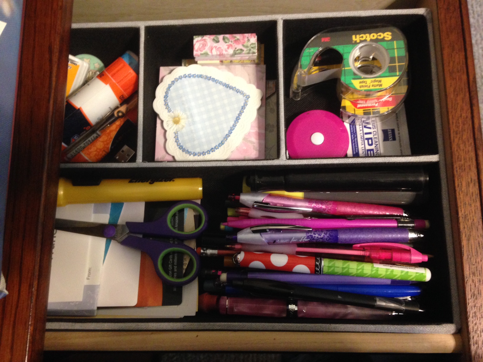 3. Drawer organization. I hadn’t planned to do this this week, but when trying to get something out of this drawer, I decided to look for a little plastic bin for the pens and pencils so they’d stop sliding all over the drawer.