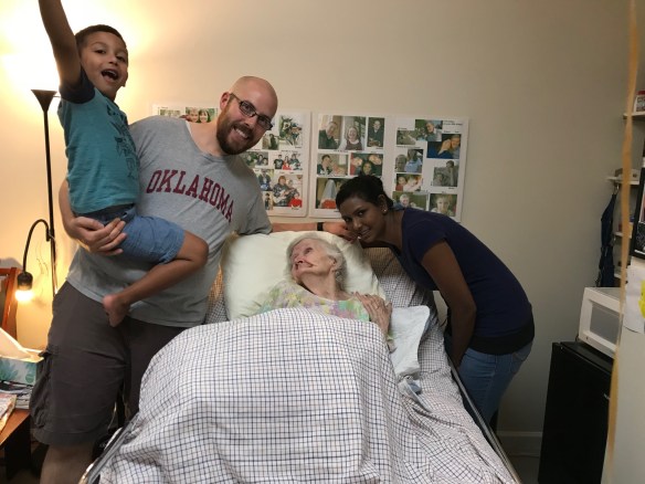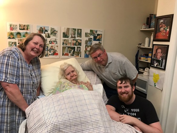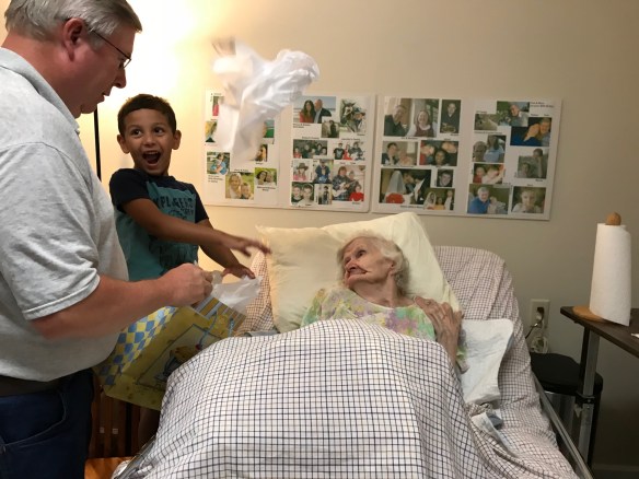 I went to a party supply store specifically to look for plates and candles with “90” on them, but all they had was a package of black napkins! So we improvised. I don’t know if she quite understood the hoopla, but I hope she enjoyed it. A bonus: I had ordered a couple of hospital-type nightgowns from a place not known for its speedy delivery, and I was afraid they wouldn’t get here in time for her birthday. But they did!