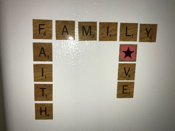 3. Scrabble tile magnets. I rediscovered these a few weeks ago when I cleaned out my pantry, but forgot to mention them. They were a gift from a while back that had gotten lost. I plan to change out the message from time to time.