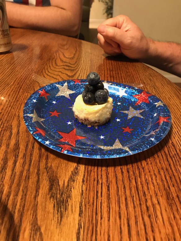 2. Mini cheesecakes. Cheesecake is not my favorite dessert, but every now and then it hits just the right spot. Some years ago someone in the family got me some mini cheesecake pans. I got ingredients for them for a potluck at church a few weeks ago, but overlooked an allergen in one of the ingredients that would affect several families, so I ended up not making them. I wanted to use the ingredients soon, so, even though cheesecake isn’t a traditional 4th of July dish, they were a nice treat. I put mini chocolate chips on some, mini peanut butter cups in others, mixed coca in with the batter for a few. Then we had strawberries, blueberries, and a peanut and chocolate shell for the plain ones. And the fruit did make them look more patriotic! The nice thing about little cheesecakes is that you can try more than one kind.