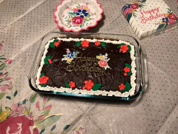 3. My birthday. My family always goes the extra mile to give me a special day. Lunch from Chick-Fil-A brought in, dinner out, wonderful gifts, and this beautiful cake made by my daughter-in-law. The plates and napkins are so pretty, too!