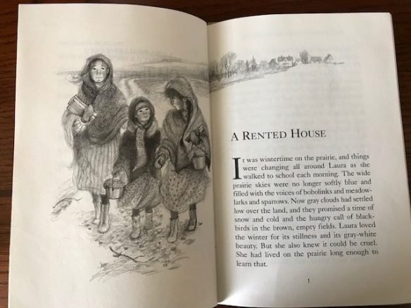 I share my friend Ann‘s concern over the placement of the book on the back cover. The top says “Read all the Little House books.” The covers of all the books are shown, with this book set in-between On the Banks of Plum Creek and By the Shores of Silver Lake. I’m assuming this was done to show that the action in this book takes place between those two. But, as fine as this book is, I would regard it as supplemental and wouldn’t include it as part of the set or as one of the LH books.