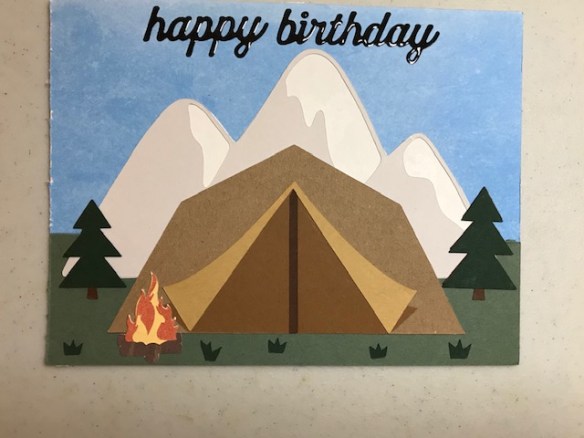 The only card I made this month was for my husband’s birthday. He’s received a lot of camping gear as gifts, so I decided to use a camping theme. The Cricut can do so much more than I use it for: I need to just play with it some time and figure some of these things out. I usually just have it cut isolated images. But I was pleased that I finally understood this time how to layer three different ones. This is one of my favorite cards yet.