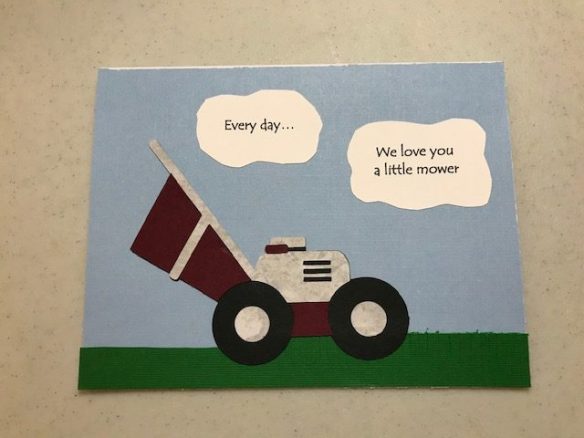 The only card I made this month was for Timothy’s birthday. I started to incorporate camping since that was the theme for the rest of his birthday. But I had seen variations on this mowing idea on Pinterest and wanted to use it. One of Timothy’s favorite things is when Granddad comes over to mow, and Timothy has turned so many items into imaginary push and riding lawn mowers. So when I saw this idea, I knew I would do it for him some time.