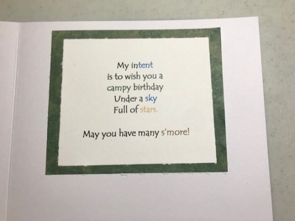 I don’t usually show the insides of the cards I make, but they can be the hardest part. I don’t want to say the same thing every time. With this one, all sorts of camping terms flooded my mind, so I wrote them down to see what I could come up with.
