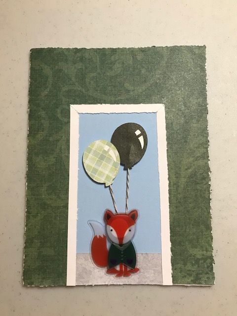This was for Jeremy’s birthday. He likes foxes, and this fox was a 3-D, multi-layer sticker. I did the balloons on the Cricut and used a sticky pad so they were as raised as the fox.