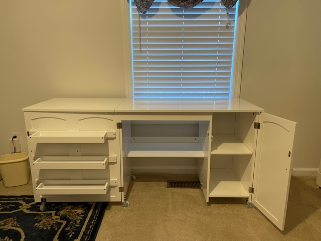 The cabinet looks like it’s worth the wait! All the helpful shelves swing out nicely when you’re sewing.