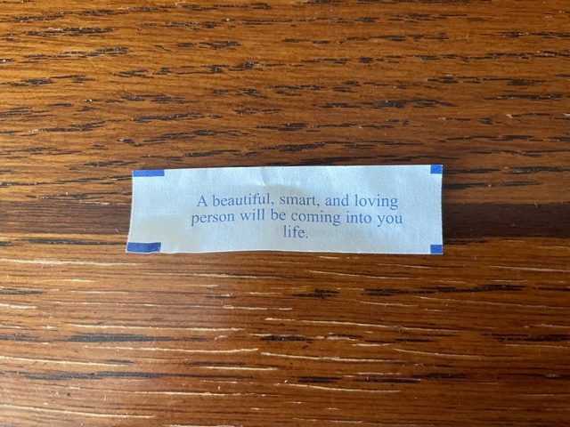 1. A sweet gesture. When we get Chinese take-out, we look at the fortune cookie messages just for fun. When my husband opened his, he said, “Nope, too late. She’s already here,” and then laid this in front of me.