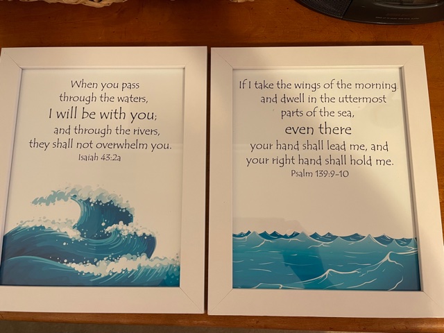 5. One project done. I had a couple of Scripture verses I wanted to incorporate into the guest room decorating. I’m working on a beachy/coastal theme in there. I found several ideas on Pinterest and Etsy and even got a couple of inexpensive printable downloads on Etsy. But they ended up looking green, when I preferred blue—and I don’t know how to adjust the coloring. So then I looked up free wave clip art and made my own. Even these are greener than I want, but they’ll do. (Sorry for the shadow.)