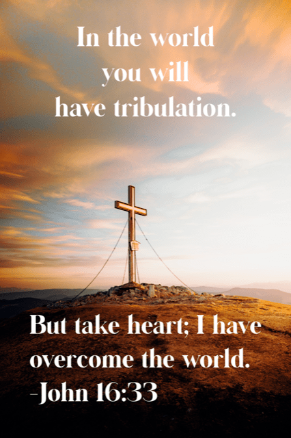 I have said these things to you, that in me you may have peace. In the world you will have tribulation. But take heart; I have overcome the world (John 16:33).