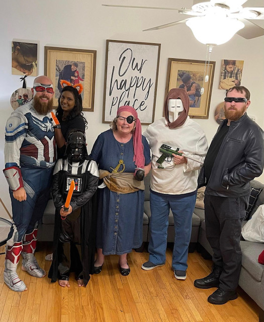 1. Family costume party. My son and daughter-in-law used to take my grandson trick-or-treating in public places like the zoo or mall. But then Covid came, and this year and last we got together as a family and dressed up in costumes. Here’s this year’s array:
