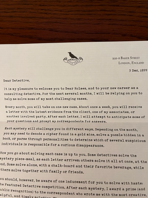 What a fun challenge the Dear Holmes mysteries must be! I do love a murder mystery (in book form, not real life…)