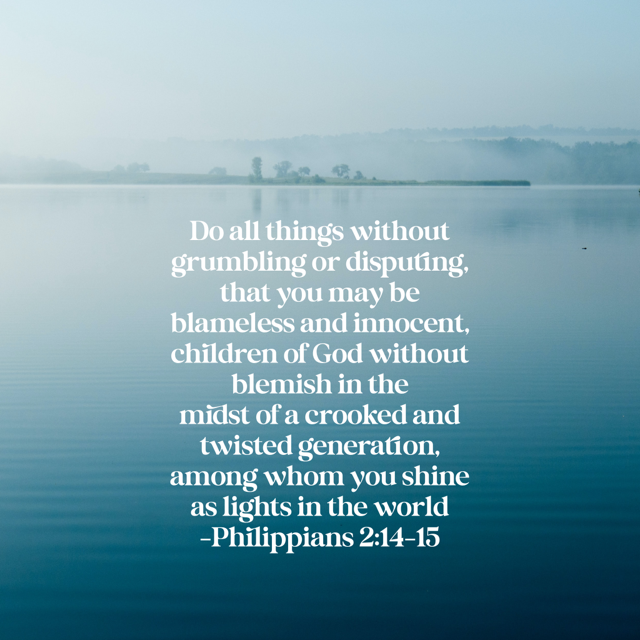Or He may want my different reaction to be a testimony, like Paul and Silas’ was. When Paul writes, “Do all things without grumbling or disputing,” he goes on to say “that you may be blameless and innocent, children of God without blemish in the midst of a crooked and twisted generation, among whom you shine as lights in the world, holding fast to the word of life” (Philippians 2:14-16a). Our lack of grumbling and arguing can be a means of shining God’s light in the world.