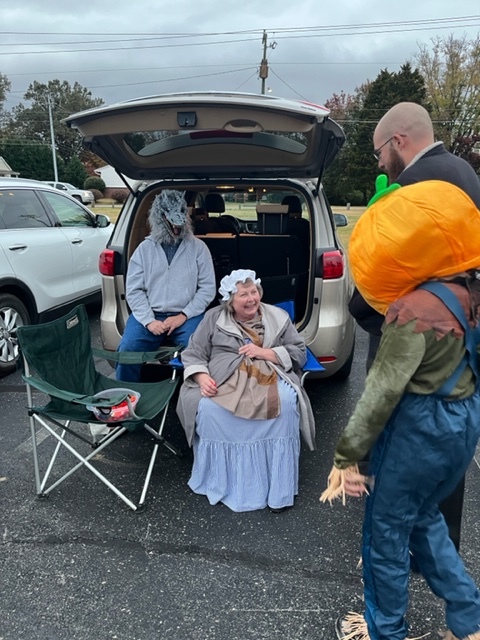 3. Trunk or Treat. We’ve never been in a church that did this. but the church we are visiting did this week both as a community outreach and to provide a safe place for kids to dress up and get candy. Most of the adults giving out candy dressed up, too. Jim and I resurrected our Red Riding Hood’s Grandmother and the Big Bad Wolf outfits from a couple of years ago. I thought some of the kids would be afraid of Jim’s mask, but they mostly just laughed or growled when they saw him. One little one kept his distance, though, and stared. Jason, Mittu, and Timothy came out for it, and it was a lot of fun.