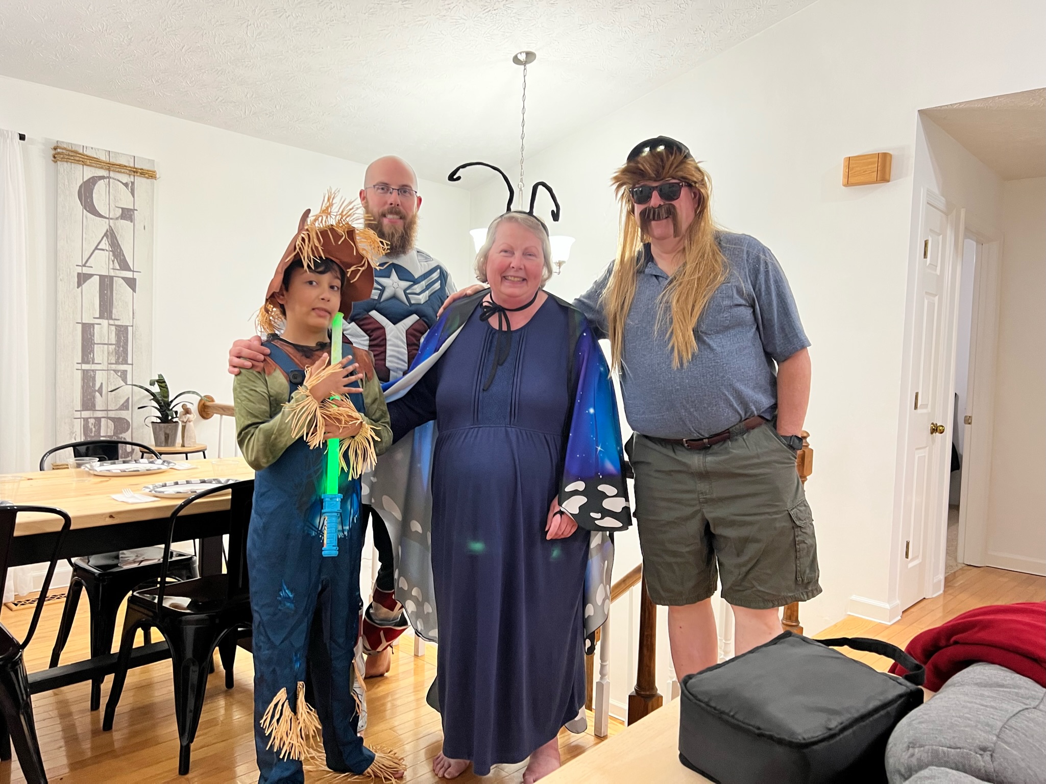3. Family dress-up party. When the pandemic closed down the usual places my son and daughter-in-law used to take my grandson trick-or-treating, they asked if we could have a family party on Halloween night. We’ve done that ever since. Here are our costumes for this year: