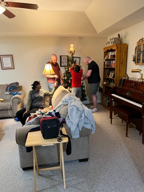 2. Tree decorating. Even though Jason and Mittu decorate their own house for Christmas, they help decorate ours as well. Jesse came over, too, and was a big help getting boxes down from the attic. For the past few years, Mittu has made lunch for us all on tree decorating day. I’m so thankful they all do this. With everyone pitching in, it only took a couple of hours to get everything up, not counting transporting the bins to and from the attic.