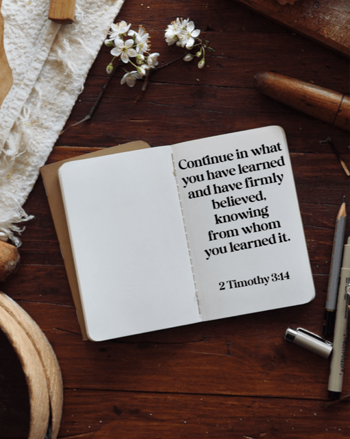 In what you have learned and believed: “But as for you, continue in what you have learned and have firmly believed, knowing from whom you learned it and how from childhood you have been acquainted with the sacred writings, which are able to make you wise for salvation through faith in Christ Jesus” (2 Timothy 3:14-15, ESV; also in KJV).
