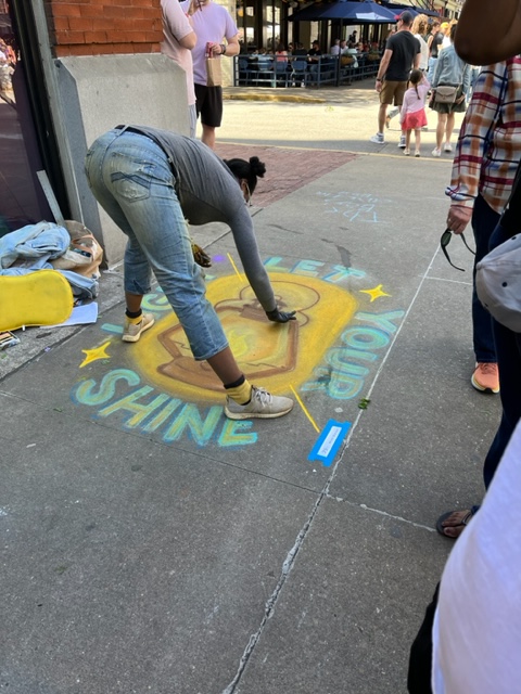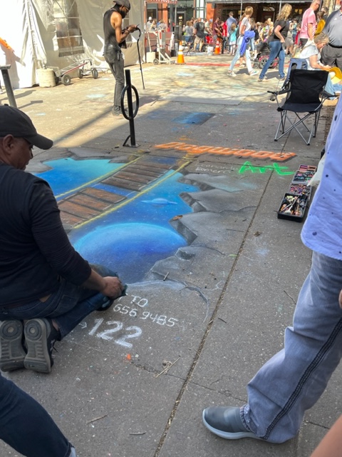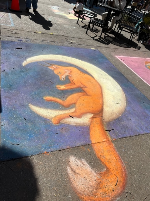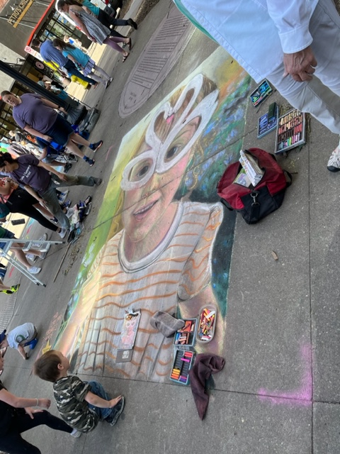 1. The annual Chalk Walk. I’ve wanted to attend this for years, but somehow we always missed it until now. It’s a day when people are invited to do chalk drawings on Market Square downtown. I’m not sure how it works–they have to sign up ahead of time and are assigned a number, and people can vote for their favorites. There are prizes in several categories, but I am not sure what they were. Some squares were done by professional artists, some just for fun, some by children. Here are a few I got pictures of: