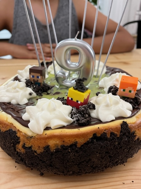 His mom made this amazing Minecraft gluten-free Oreo cheesecake for his birthday.