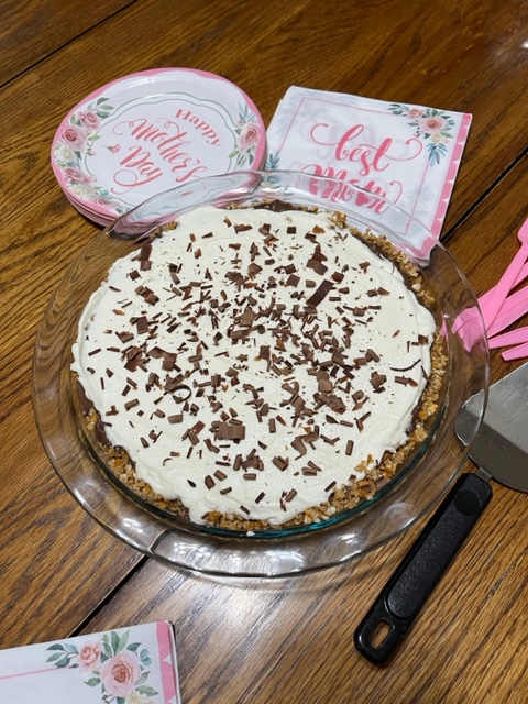 3. Mother’s Day. Jim grilled burgers, Jesse shucked corn on the cob and other assorted things, Jason made Chocolate Pretzel Pie.