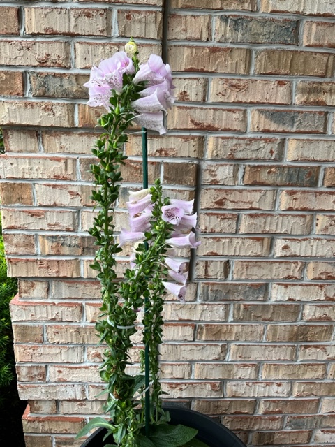 As we were walking around the garden center, we spied this interesting looking plant. We found it was a foxglove, so we decided to get it for the front porch. I didn’t know they grew so tall–about four feet. It has become something of a conversation piece.