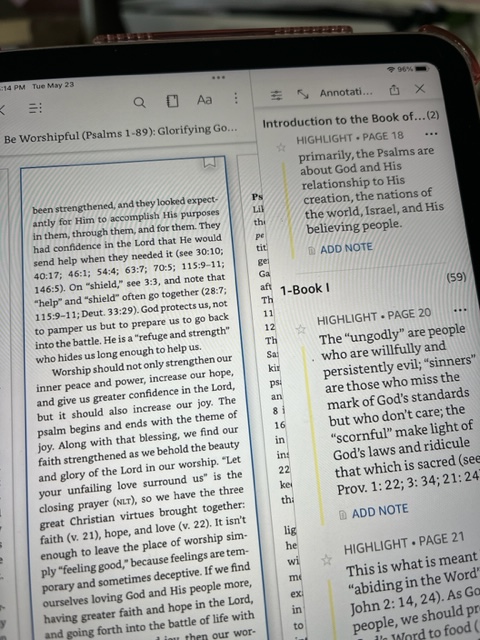 Add notes. When you highlight a section, an icon will show up at the top that looks like a paper and pencil. You can tap that and add your own notes–like writing in the margin of a paper book.