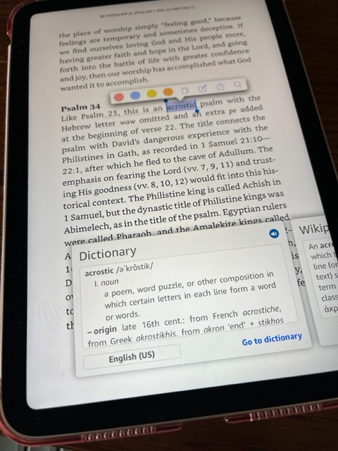 Built-in dictionary. If I come across an unfamiliar word while reading, I don’t usually take the time to stop and look it up. I get the gist of it from the context and keep going. But in the Kindle app, you can highlight the word, then a dictionary definition will pop up. I’ve gotten so used to that feature, I’ve wished it was available on everything I read online as well as in ink-and-paper books!