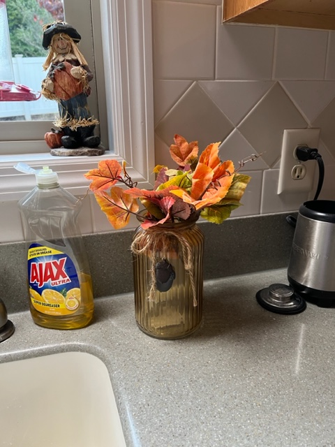 5. New fall arrangement. Before all of this, when I set out my fall decorations, I was missing a little cream colored pitcher where I usually place some fake fall leaves. I found another fallish vase, but it was larger, and the proportion wasn’t right.
