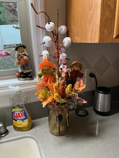 Praying all goes well with your husband. Nice that your daughter in law made you some meals. I love scarecrows and your new decor. I have something similar under my kitchen window.