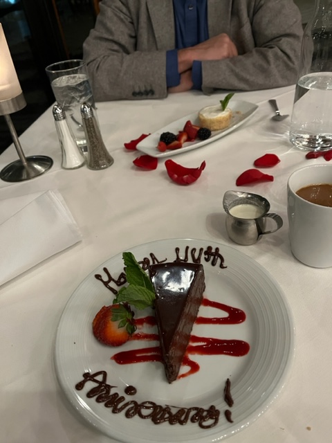 Happy belated Anniversary. That chocolate dessert looks amazing.