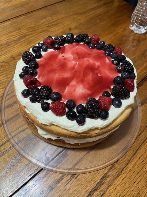 2. Father’s Day. We enjoyed celebrating Jim and Jason with stroganoff, and a Chantilly cake Mittu made with berries on top and between layers.