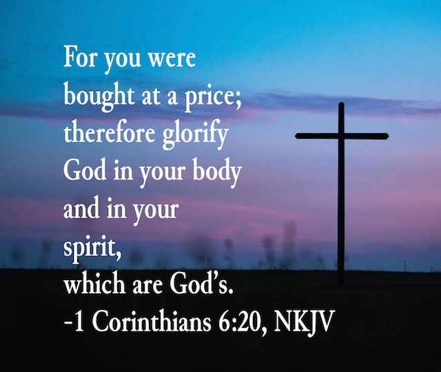 “For you were bought at a price; therefore glorify God in your body and in your spirit, which are God’s” (1 Corinthians 6:20, NKJV).