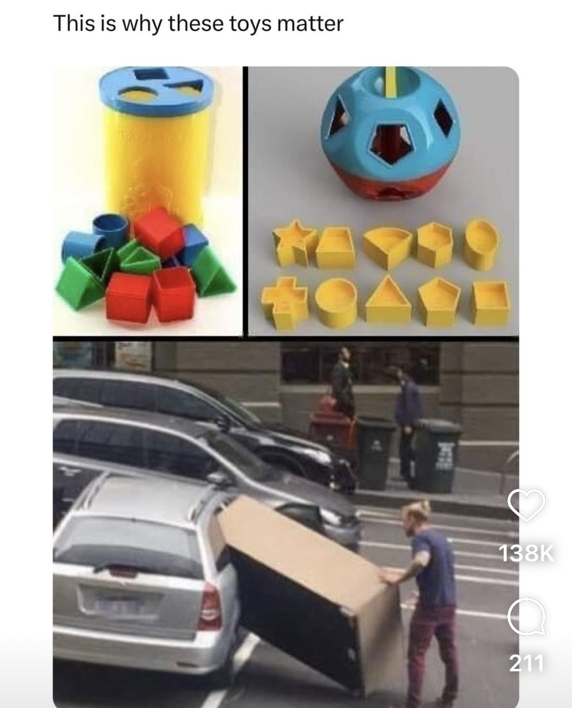 I laughed out loud at that picture – we had those exact toys when my kids were little. Hopefully their spatial awareness is better than that lol. Sounds like you had a good week, hope the weekend is good too.