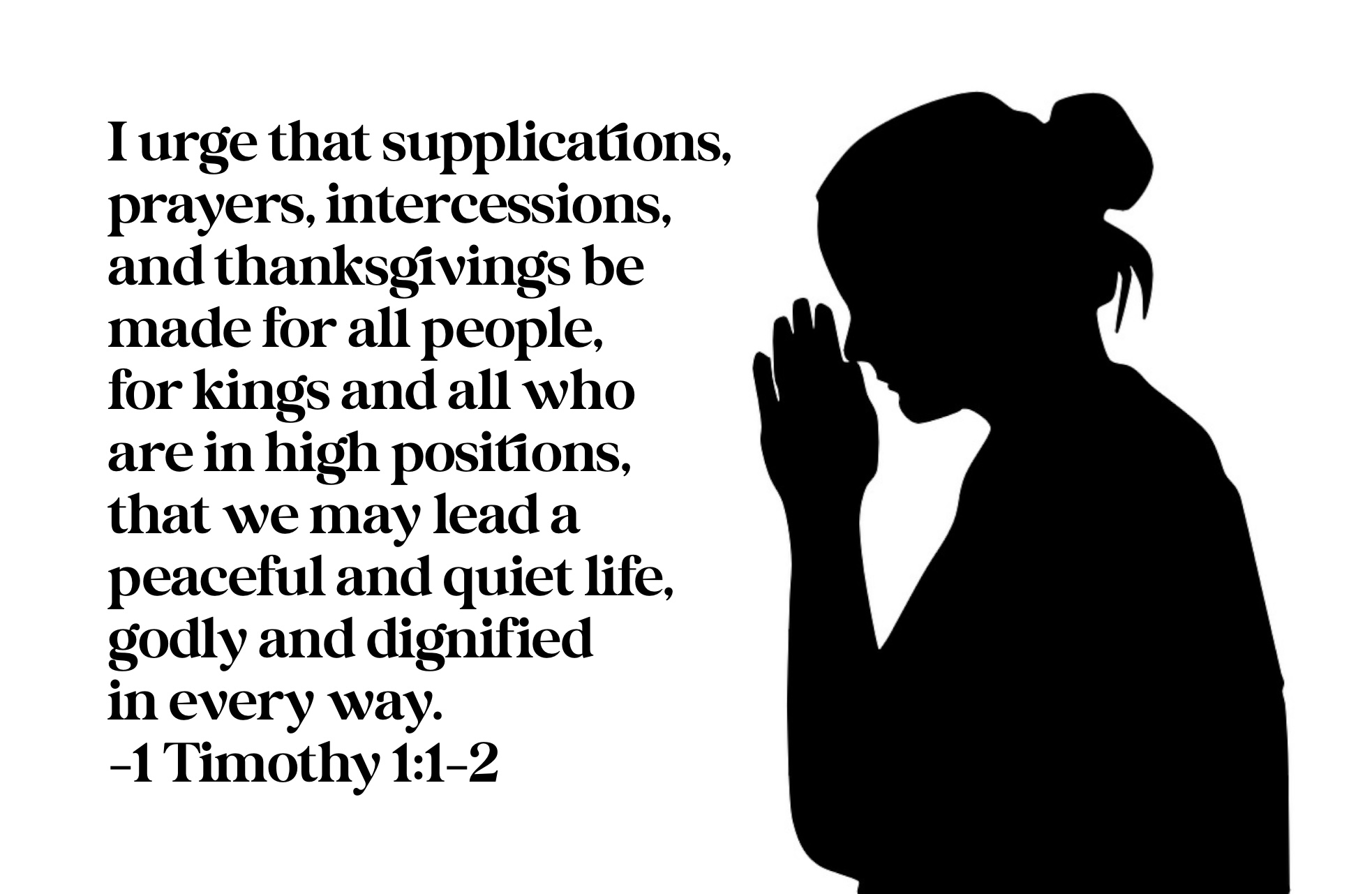 - Pray for them. “First of all, then, I urge that supplications, prayers, intercessions, and thanksgivings be made for all people, for kings and all who are in high positions, that we may lead a peaceful and quiet life, godly and dignified in every way (1 Timothy 2:1-2).