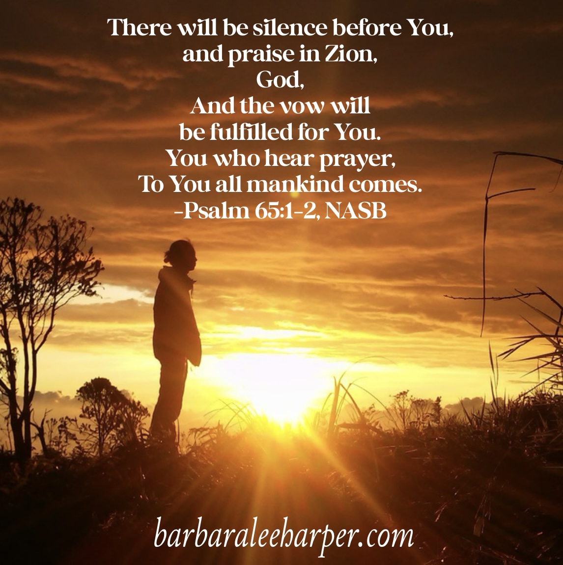 Psalm 65 starts with silence and ends with shouting and singing. Sometimes our silent worship and contemplation of God’s word and character will erupt into boisterous praise. Sometimes singing God’s songs with other believers will give us something to take home and think about in silence. Some days, and some seasons of life, lend themselves to silence, others to loud praise. Whether we come before the Lord in silence or with singing and shouting, we know He is with us and will hear us.